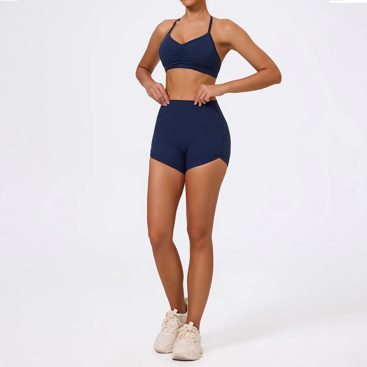 Cet ensemble de sport pour femme allie confort, maintien et féminité grâce à son design froncé au niveau de la poitrine et à son short effet sculptant. Sa brassière à bretelles fines offre une allure élégante tout en assurant un maintien léger à moyen, idéal pour le yoga, le fitness doux, la marche ou les séances d’entraînement à intensité modérée.